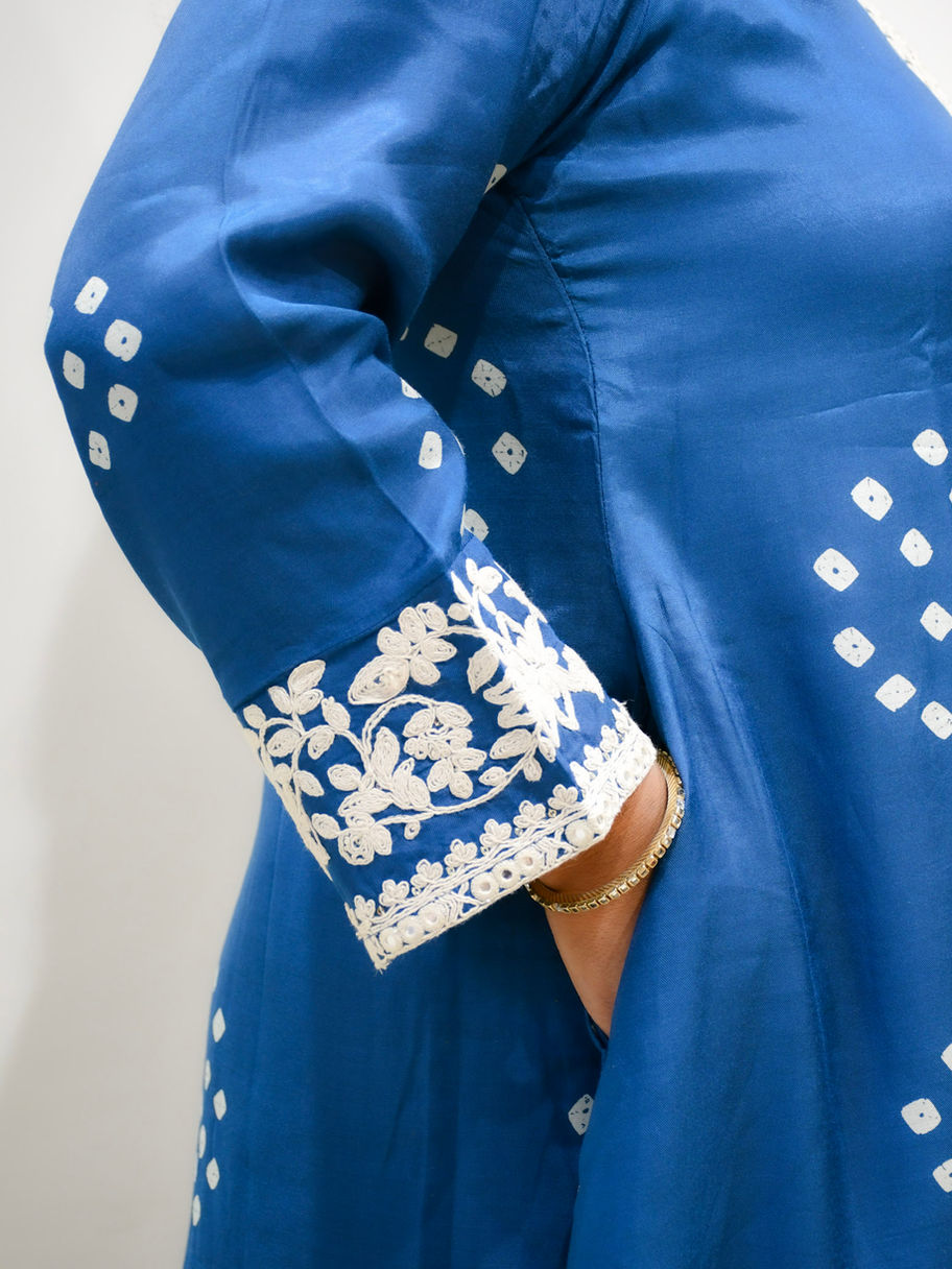 A perfect blend of modern elegance and traditional craft, our Aaranya Blue Bandhej Embroidered Kurta Set is crafted in a soft, silky cotton-blend fabric that drapes beautifully. The kurta features Bandhej-inspired dot motifs placed thoughtfully across the front and sleeves, giving it a festive yet minimal appeal.