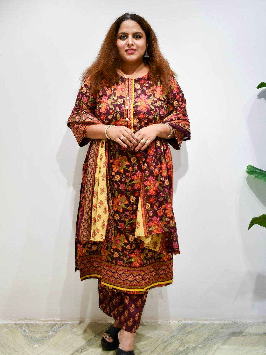 The Abeer Aangan Kurta Set celebrates rich colours and timeless prints. Crafted in comfortable fabric, the kurta features vibrant digital floral prints on a deep maroon base, complemented by a beautifully detailed neckline with button accents.