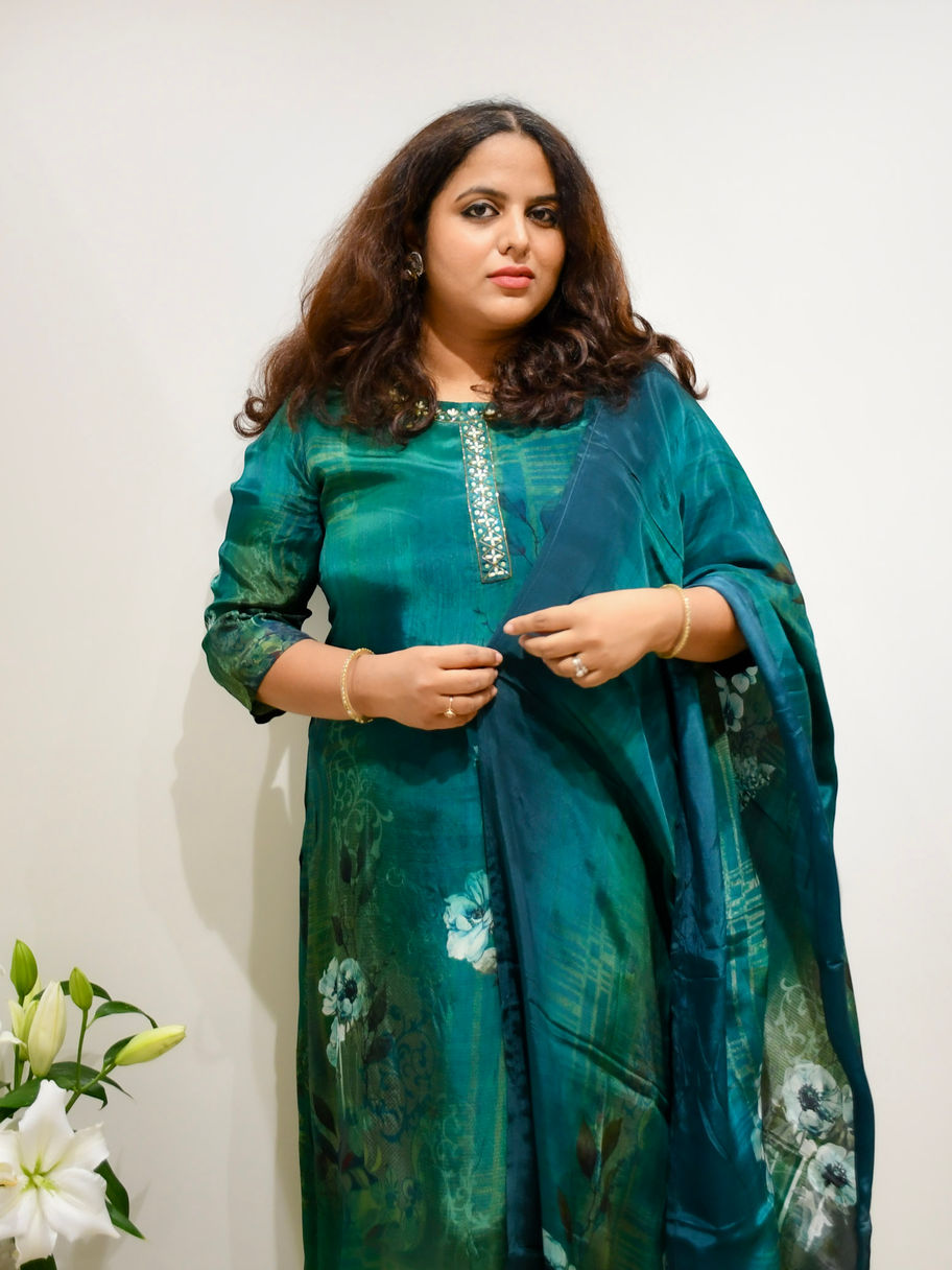 Drape yourself in effortless sophistication with our Emerald Whisper Muslin Kurta Set, crafted in premium muslin that carries a natural, luminous sheen. The digital print blends deep emerald tones with soft floral accents, creating a dreamy, painterly effect. The neckline features delicate handwork with mirror and bead embellishments, adding just the right touch of festive sparkle.