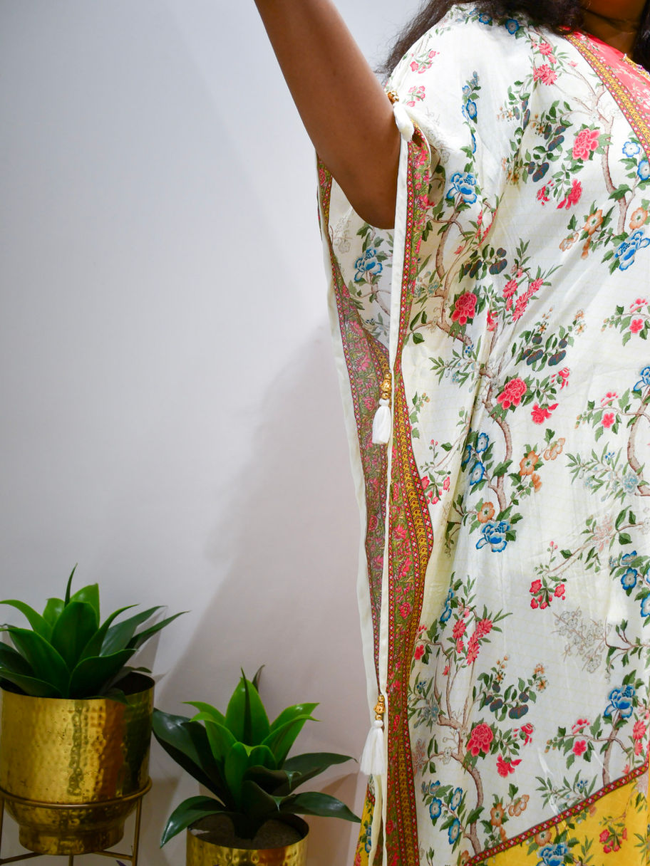 Elevate your festive and everyday style with our Gulnar Crepe Kaftaan Set, crafted in premium natural crepe fabric for a lightweight, breathable, and flowy silhouette. This designer kaftaan features a striking coral-red panel with floral prints, bordered with vibrant yellow motifs and intricate detailing for a contemporary yet traditional look. The relaxed fit with wide sleeves ensures effortless comfort, while the straight white pants add a touch of elegance and versatility.