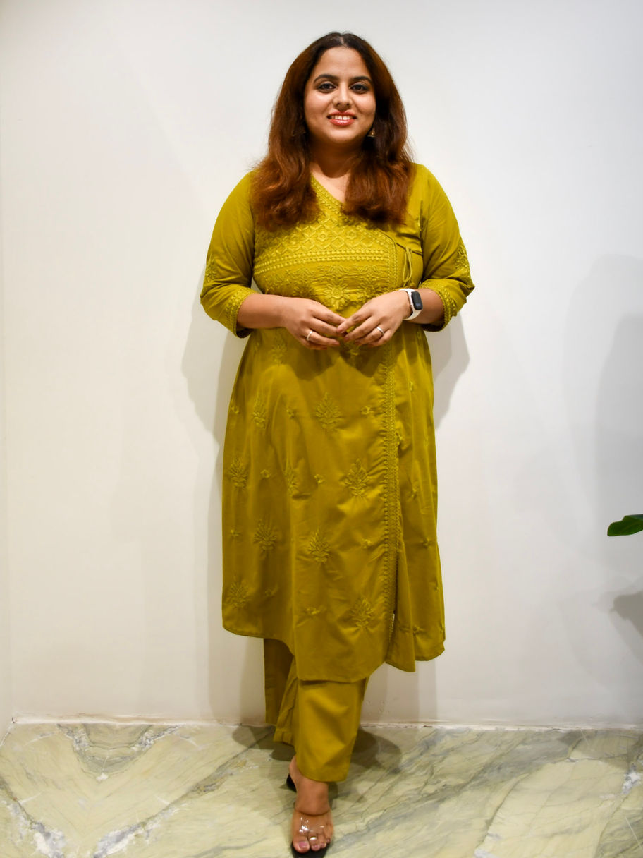 Radiate festive elegance with the Mehendi Noor Set, a timeless pure cotton kurta set designed for comfort, grace, and everyday celebrations. Crafted in breathable, skin-friendly cotton, this beautiful mehendi green ensemble features intricate tonal embroidery across the yoke and scattered motifs throughout the kurta, creating a rich yet subtle statement.