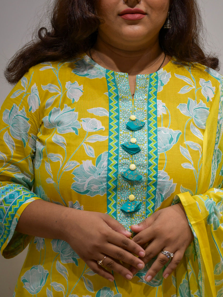 Step into sunshine with the Morning Meadow Kurta Set, crafted in soft, breathable cotton for everyday comfort. The bright yellow base is adorned with refreshing floral prints in soothing aqua tones, paired with a matching dupatta for a graceful finish. Its intricate button and neckline detailing add a touch of charm, making it the perfect blend of casual elegance and festive freshness. Ideal for daytime outings, festive gatherings, or work wear, this kurta set keeps you stylish and easy all day long.