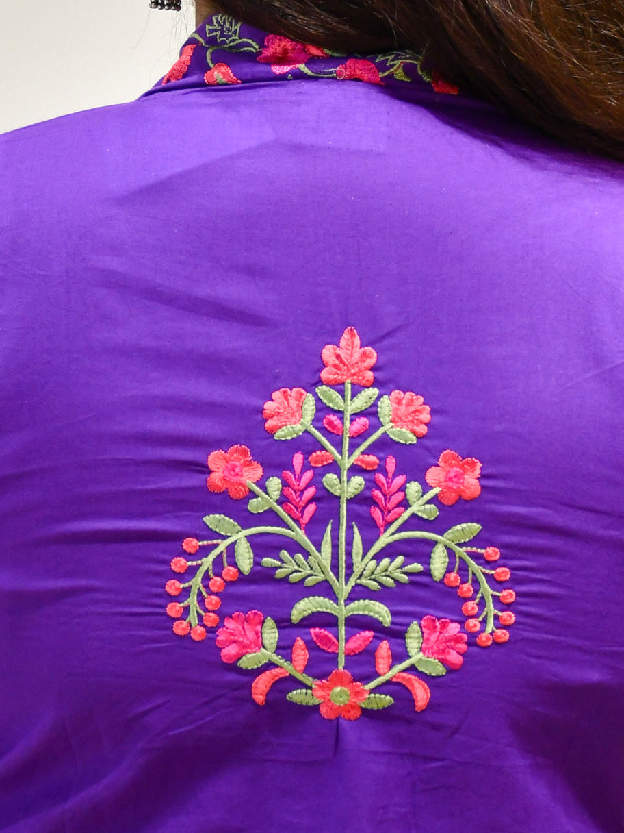 Celebrate effortless elegance with the Purple Aura Kurta Set, crafted in breathable cotton for comfort and style. The kurta features delicate floral embroidery on the neckline, sleeves, and back, highlighted by its rich purple hue. Thoughtfully designed with side pockets, this set is perfect for festive gatherings, casual outings, or everyday wear. Pair it with statement earrings and juttis for a graceful, easy-to-wear look that blends tradition with modern charm.