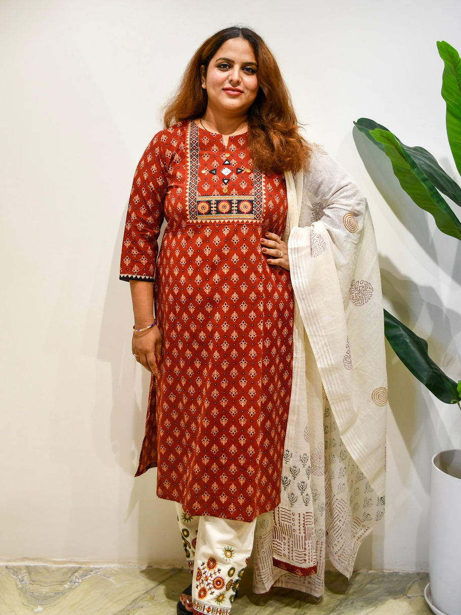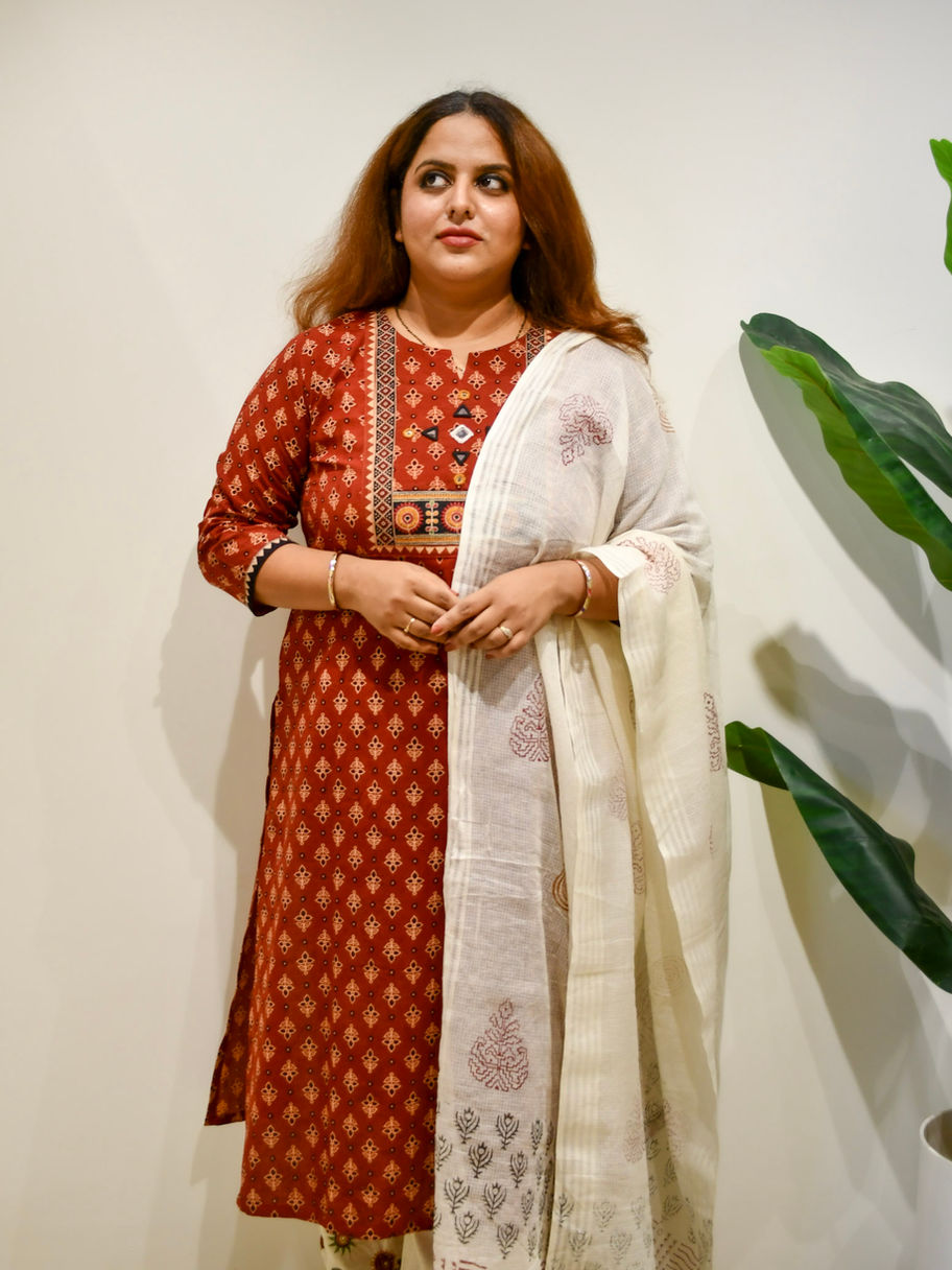 A striking Bagru print kurta set in a rich earthy red, showcasing traditional handblock motifs with intricate yoke detailing inspired by heritage patterns. Paired with a complementing printed dupatta and coordinated bottoms, this set blends artisanal charm with everyday wearability. Crafted for comfort and timeless appeal, it’s perfect for festive daywear, cultural gatherings, and effortless ethnic styling.