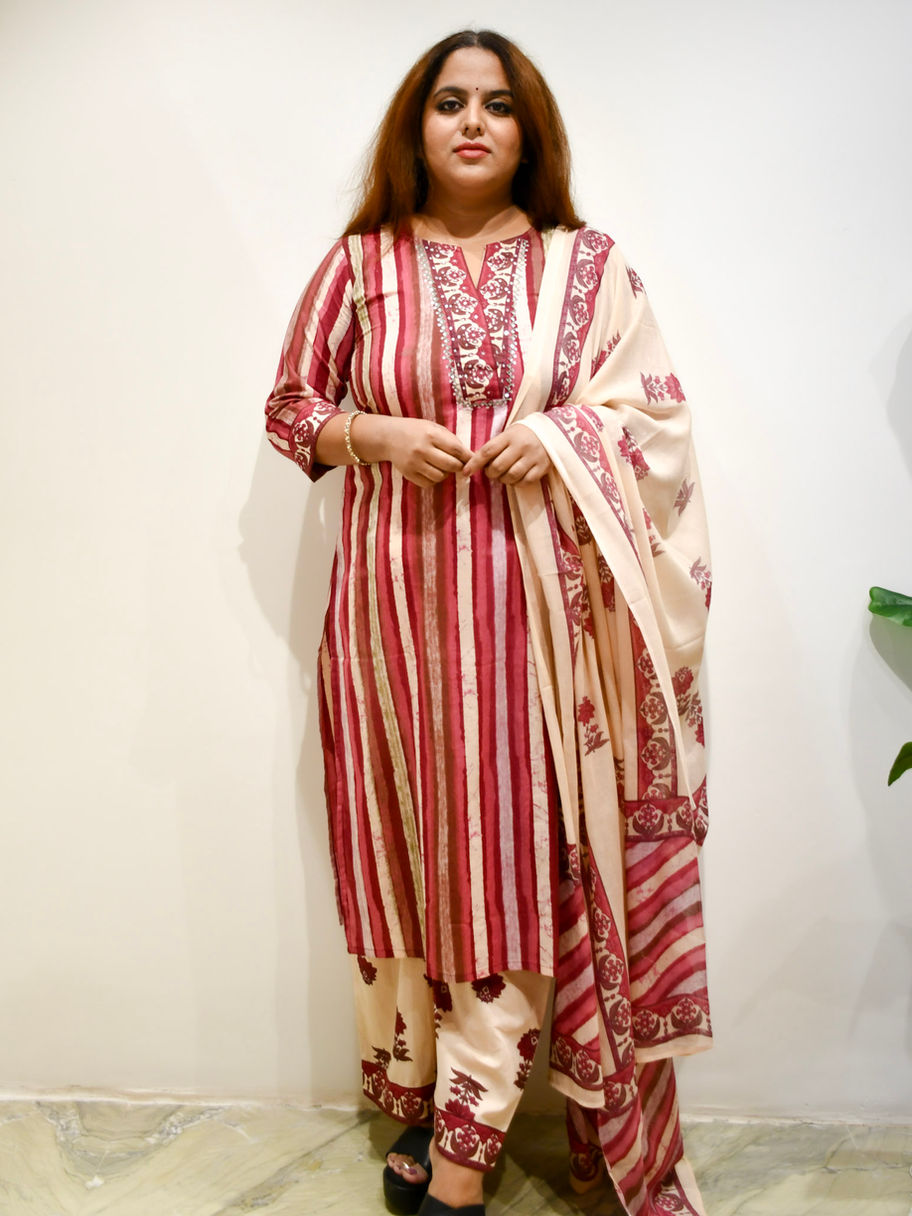 Make a statement in timeless elegance with our Surkh Stripe Cotton Kurta Set, crafted in breathable pure cotton for effortless everyday sophistication. Designed in striking surkh red and soft ivory vertical stripes, this silhouette flatters while keeping you comfortable through warm days.
